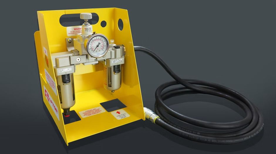 De RP-FRL Unit wordt gebruikt om de luchttoevoer te filteren en te smeren, en om de druk te regelen voor de gewenste koppeloutput. De unit wordt geleverd compleet met een manometer en 2,4 m luchtslang, en is voorzien van een uit één stuk gelast stalen frame voor bescherming en transport.