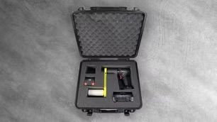 Aangepast schuimrubberen inzetstuk om gereedschap met bevestigde arm te passen, samen met batterij en oplader.